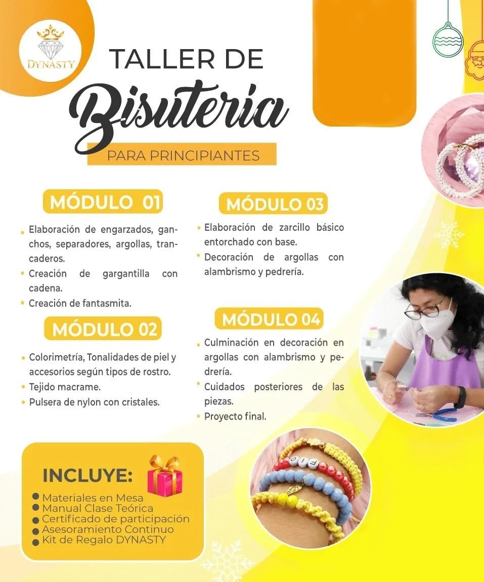 Desarrolla tu creatividad aprendiendo a diseñar y elaborar accesorios únicos y personalizados. En este curso descubrirás técnicas para crear collares, pulseras, aretes y anillos utilizando materiales como mostacillas, alambres y piedras decorativas.